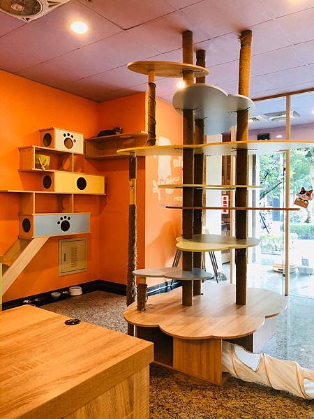 我們選擇的座位是可以跟貓貓互動的區域,一進入映入眼簾的就是超大的貓跳台~