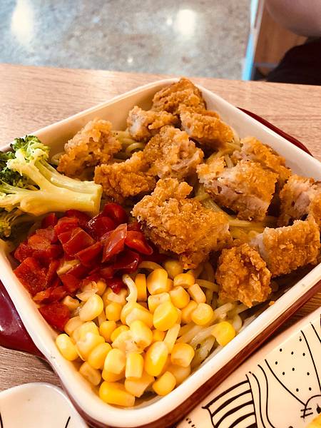 非常豐富的義麵,有紅椒、玉米、花椰菜、卡啦雞搭配青醬義麵,完美的融合在一起,非常飽足又好吃!!
