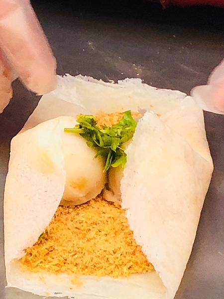 首先是潤餅皮加上滿滿花生粉放上兩球冰淇淋在撒上些許香菜點綴!!