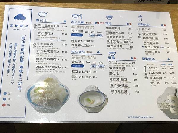 菜單主要分為(雪花冰、杏仁類、木耳、甜湯已及外帶的飲品)可以供食客們做選擇