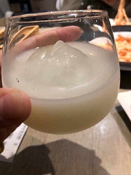 兩種水果混合在一起中間放一個很大的冰塊中和酒的濃烈