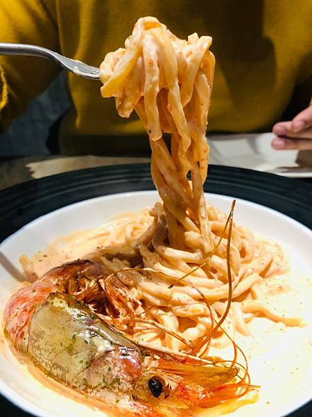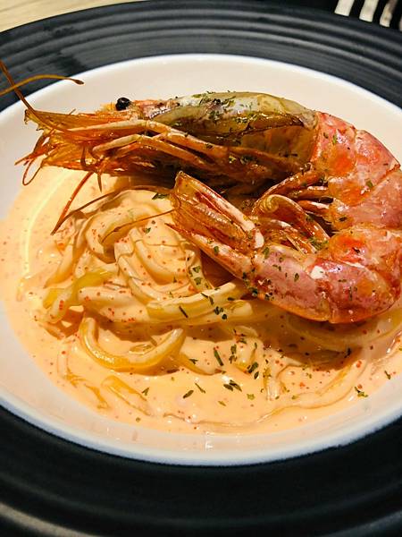 明太子鮮蝦麵,使用的是粉紅醬上面還鋪上一大隻天使紅蝦