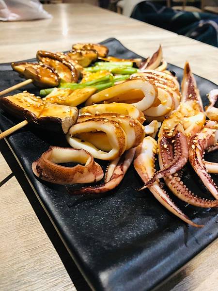 首先上菜的是我們的香菇串、蔬菜串跟烤大魷魚