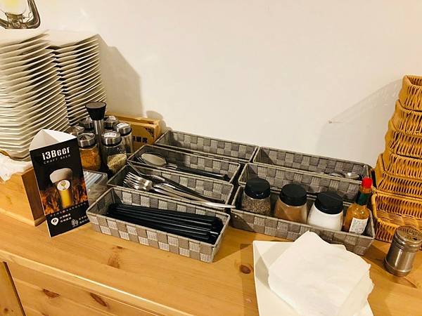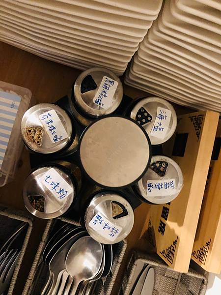至於水杯、餐具還有調味料就得要在旁邊自取使用囉