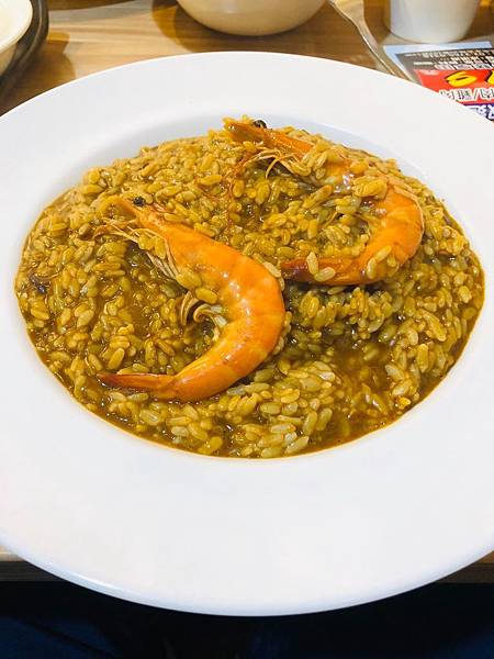 再來是我最愛的咖哩海鮮燉飯,一上菜就有兩隻大蝦蝦放在上頭,看似平凡但裡面卻隱藏著大大的美味