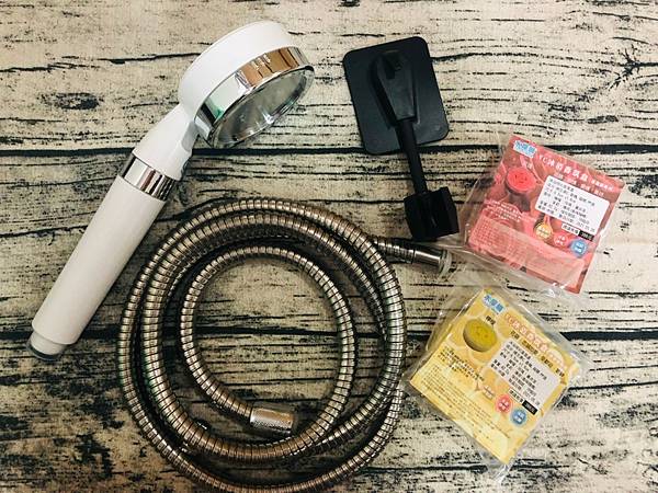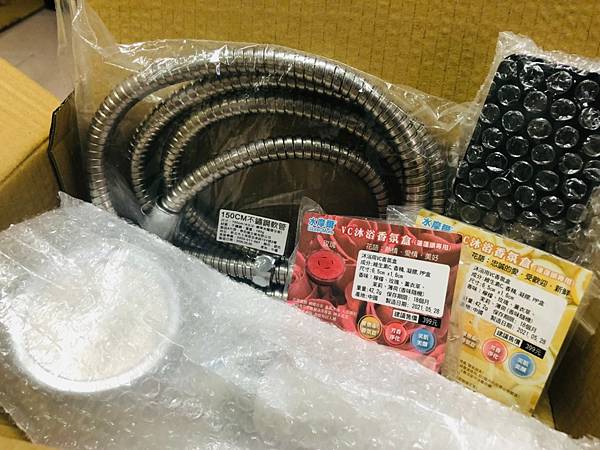 內容物有~~蓮蓬頭、萬向掛座、軟管、沐浴香氛盒*2