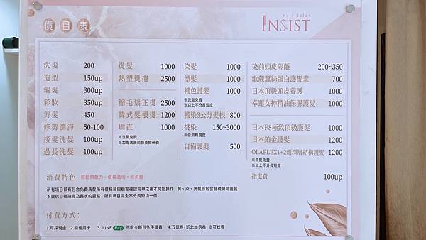 奉上Insist Hair Salon價目表