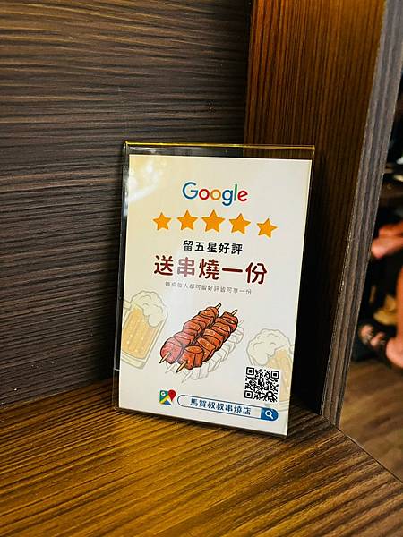 只要消費並且在Google評論五星就可以免費獲得串燒一份喔!