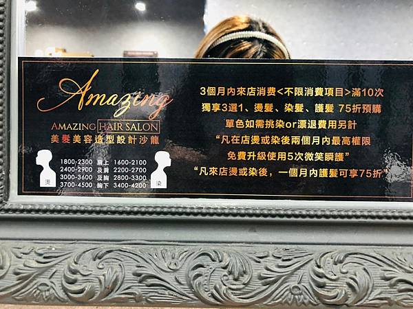附上Amazing hair salon店內的價目表及優惠活動