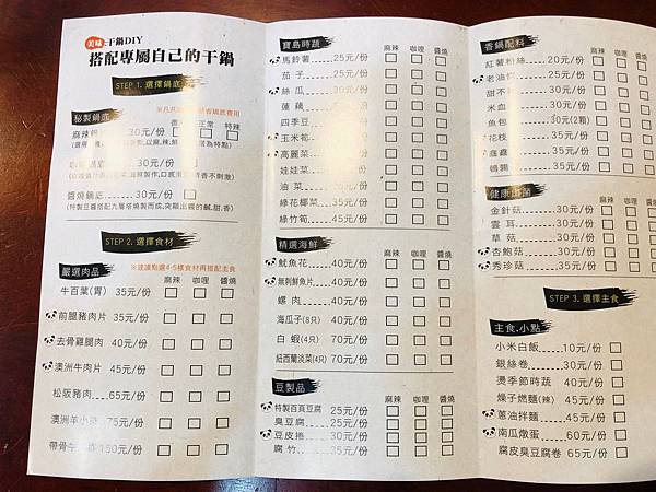 再來讓我們來看看菜單,主要是先選擇鍋底,有麻辣、咖哩、醬燒三種口味,另外還有非常多菜色可以讓你們點選,把喜歡的食物一次幫你料理好~